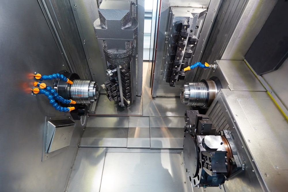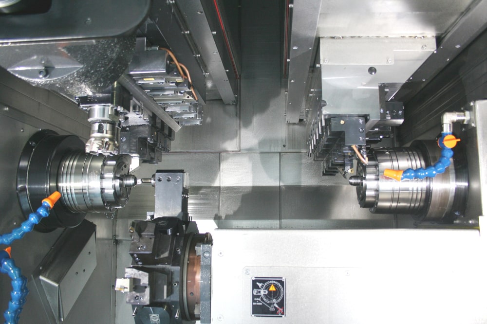 La característica “superimposition” del control permite el corte simultáneo con 3 herramientas para conseguir mejores ciclos de producción. Tanto con la torreta como con el peine de herramientas trabajando en el cabezal principal la torreta puede trabajar en el subcabezal.