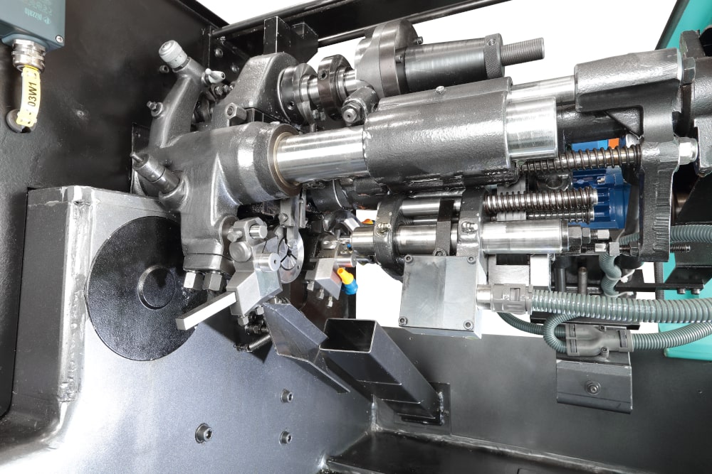 La máquina integra dos motores asíncronos que, controlados mediante variadores de frecuencia, accionan el motor del cabezal y el motor del eje de levas por independiente.